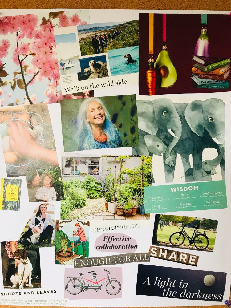 Set a new 15 minutes alarm. Take the piece of A2 card and, with the help of your scissors and glue, arrange your images and words on to it in a way that pleases you. You may use only some of your clippings. You may also choose to embellish it with coloured pens and/or glitter. Remember, it’s your collage and however you do it is perfect!
